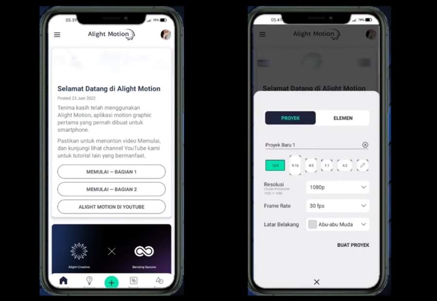 Langkah pertama adalah buka Aplikasi Alight Motion kamu. Kemudian, atur resolusi. Pastikan bahwa resolusi, frame rate, dan latar belakang video yang akan kamu edit sudah benar.