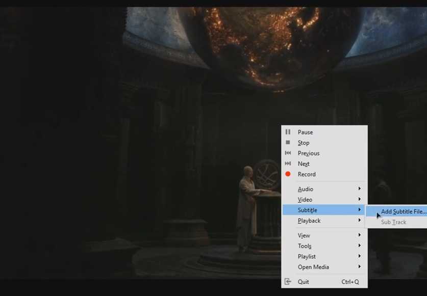 2. Buka file film dan klik Play > saat film sudah mulai segera Pause > lalu klik kanan dan pilih Subtitle > Add Subtitle File.
